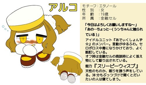 アイドルユニット『あでいくしょんず☆』のメンバー。言動がゆるふわ。セロポロス中毒になりかけており、よく酩酊している。オフ時は金融セルの商談時によく添え物として駆り出されている。