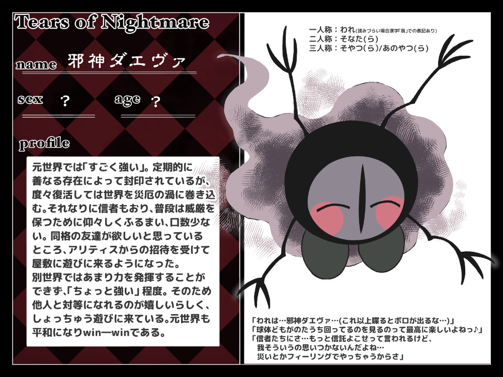 元世界では「すごく強い」。 定期的に善なる存在によって封印されているが、度々復活しては世界を災厄の渦に巻き込む。それなりに信者もおり、普段は威厳を保つために仰々しくふるまい、口数少ない。 同格の友達が欲しいと思っているところ、アリティスからの招待を受けて屋敷に遊びに来るようになった。