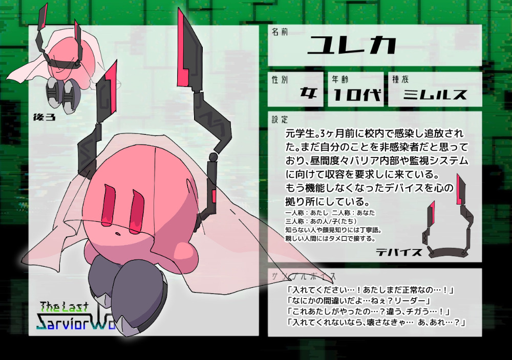 元学生。3ヶ月前に校内で感染し追放された。まだ自分のことを非感染者だと思っており、昼間度々バリア内部や監視システムに向けて収容を要求しに来ている。もう機能しなくなったデバイスを心の拠り所にしている。