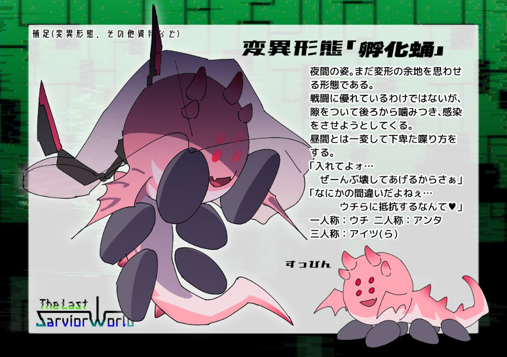 夜間の姿。まだ変形の余地を思わせる形態である。戦闘に優れているわけではないが、隙をついて後ろから噛みつき、感染をさせようとしてくる。昼間とは一変して下卑た喋り方をする。