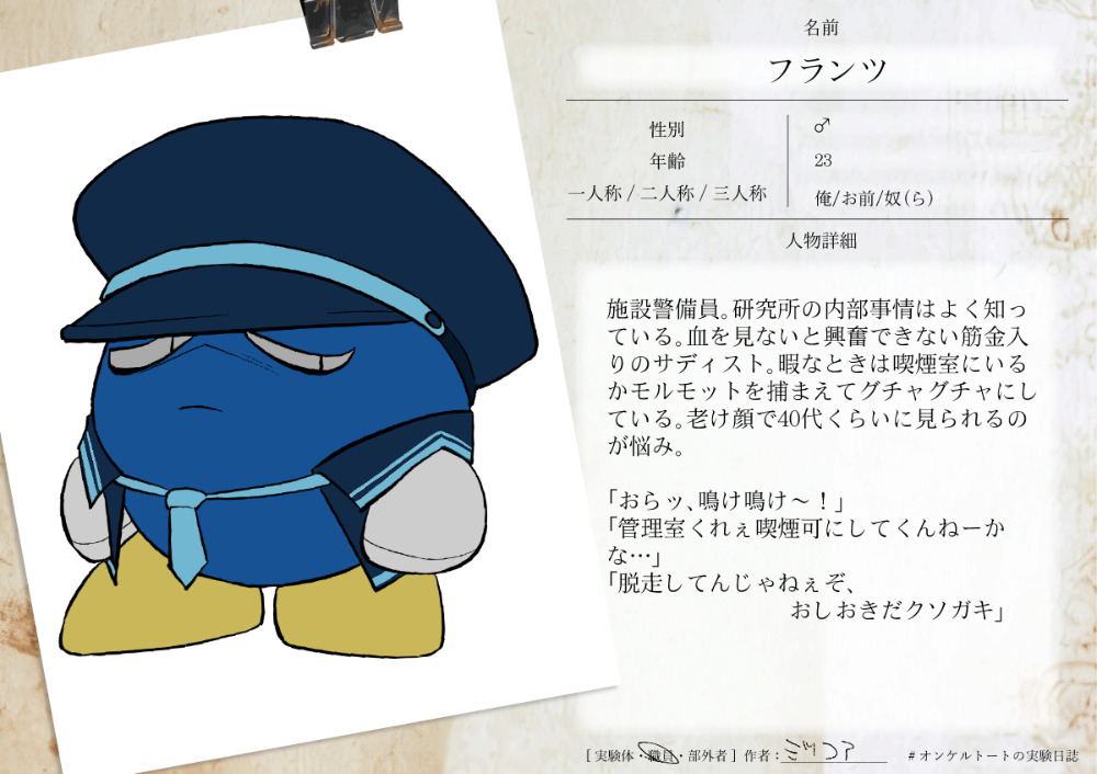 研究所の内部事情はよく知っている。血を見ないと興奮できない筋金入りのサディスト。暇なときは喫煙室にいるかモルモットを捕まえてグチャグチャにしている。老け顔で40代くらいに見られるのが悩み。