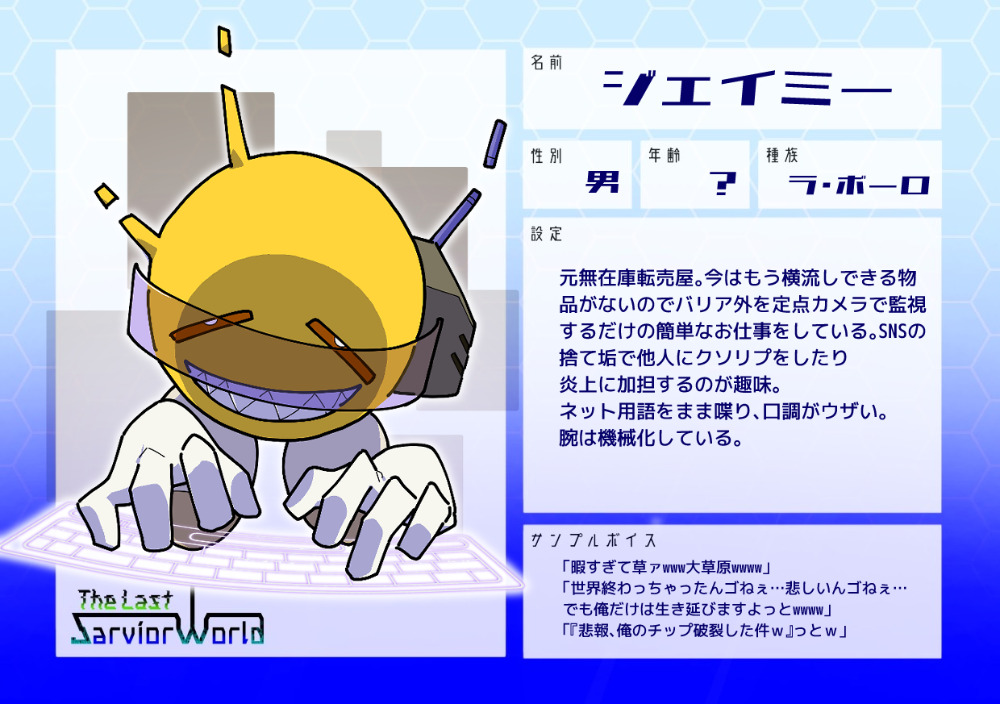 元無在庫転売屋。今はもう横流しできる物品がないのでバリア外を定点カメラで監視するだけの簡単なお仕事をしている。SNSの捨て垢で他人にクソリプをしたり炎上に加担するのが趣味。