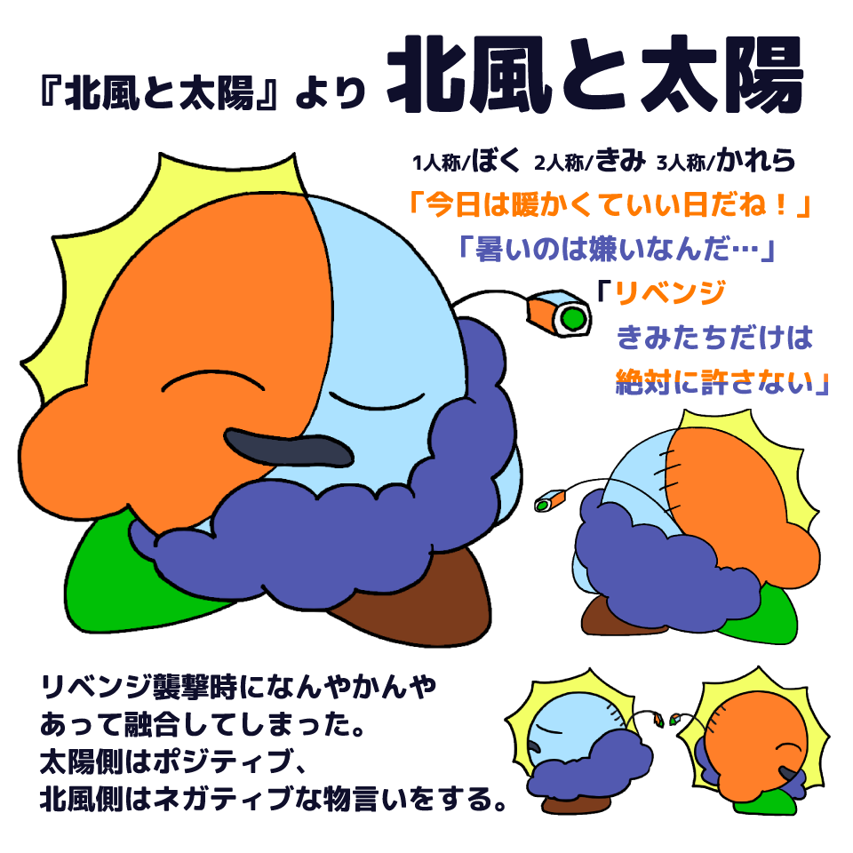 リベンジ襲撃時になんやかんやあって融合してしまった。太陽側はポジティブ、北風側はネガティブな物言いをする。