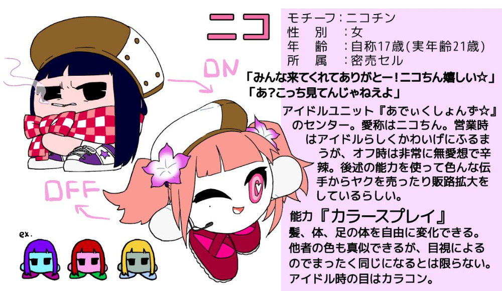 アイドルユニット『あでいくしょんず☆』のセンター。愛称はニコちん。営業時はアイドルらしくかわいげにふるまうが、オフ時は非常に無愛想で辛辣。後述の能力を使って色んな伝手からヤクを売ったり販路拡大をしているらしい。