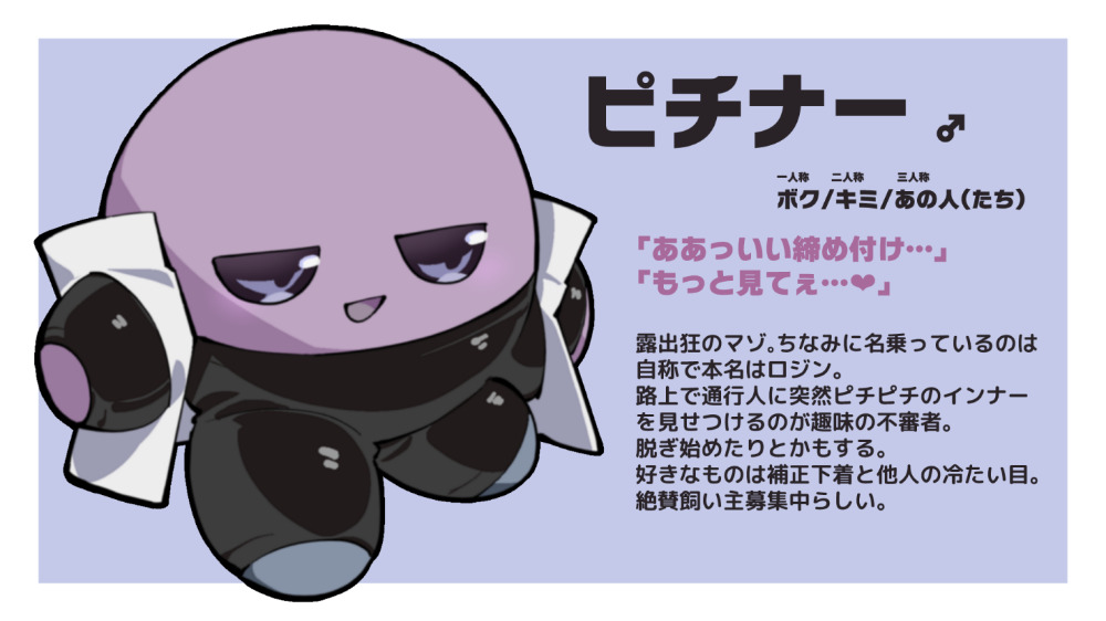 露出狂のマゾ。ちなみに名乗っているのは自称で本名はロジン。路上で通行人に突然ピチピチのインナーを見せつけるのが趣味の不審者。脱ぎ始めたりとかもする。好きなものは補正下着と他人の冷たい目。絶賛飼い主募集中らしい。昔は戦隊にブルーとして所属していた。