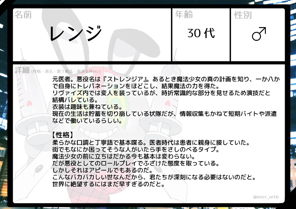 元医者。悪役名は『ストレンジア』。あるとき魔法少女の真の計画を知り、ーか八かで自身にトレパネーションをほどこし、結果魔法の力を得た。