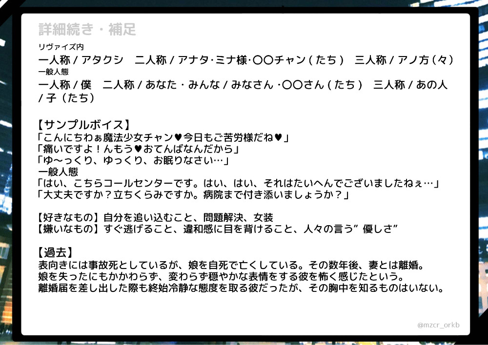 柔らかな口調と丁寧語で基本喋る。医者時代は患者に親身に接していた。