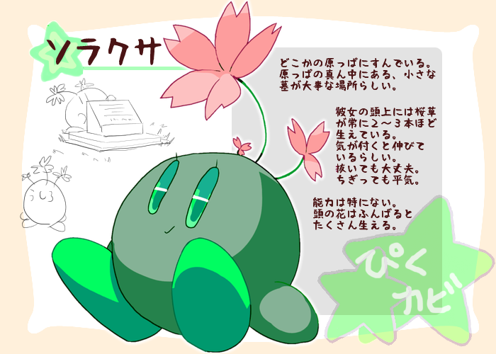 どこかの原っぱにすんでいる。原っぱの真ん中にある、小さな基が大事な場所らしい。彼女の頭上には桜草が常に2~3本ほど生えている。気が付くと伸びているらしい。抜いても大丈夫。ちぎっても平気。頭の花はふんばるとたくさん生える。