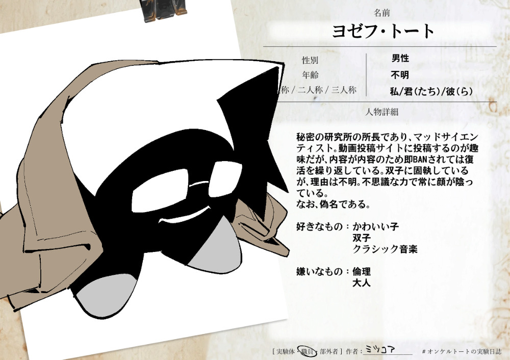 秘密の研究所の所長であり、マッドサイエンティスト。動画投稿サイトに投稿するのが趣味だが、内容が内容のため即BANされては復活を繰り返している。双子に固執しているが、理由は不明。不思議な力で常に顔が陰っている。なお、偽名である。